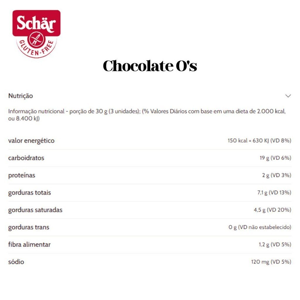 (*) Valores diários de referência com base em uma dieta de 2000 kcal ou 8400 kJ. Seus valores diários podem ter maiores ou menores dependendo de suas necessidades energéticas.